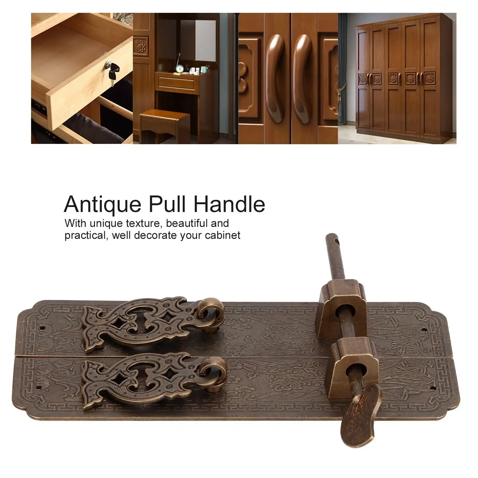 Features | 1、Retro appearance, with unique texture, exquisite craftsmanship, can match any decorative style. 2、Made of high‑quality copper material, durable, rust‑proof, anti‑corrosion, non ‑ fading. 3、Suitable for most furniture, such as cabinets, dressers, wardrobes, closets, cupboards, etc. 4、With mounting accessories, it is easy to install and use, and has a long service life. 5、Chinese style furniture handles, beautiful and practical, add a striking style to your home. |