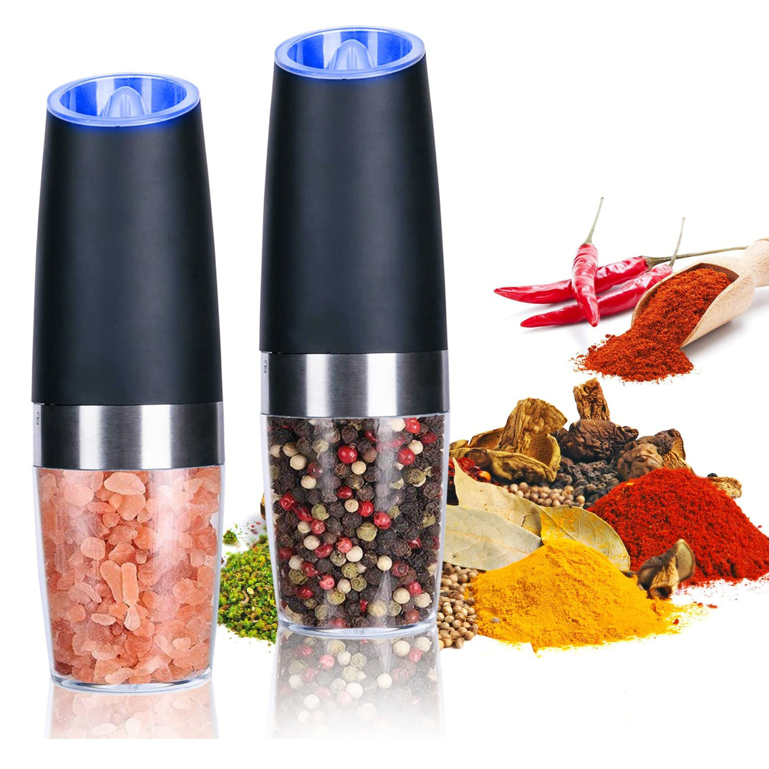Gravity Electric Pepper and Salt Grinder Set Adjustable Coarseness Battery Powered with LED Light Stainless Steel Black 2 Pack