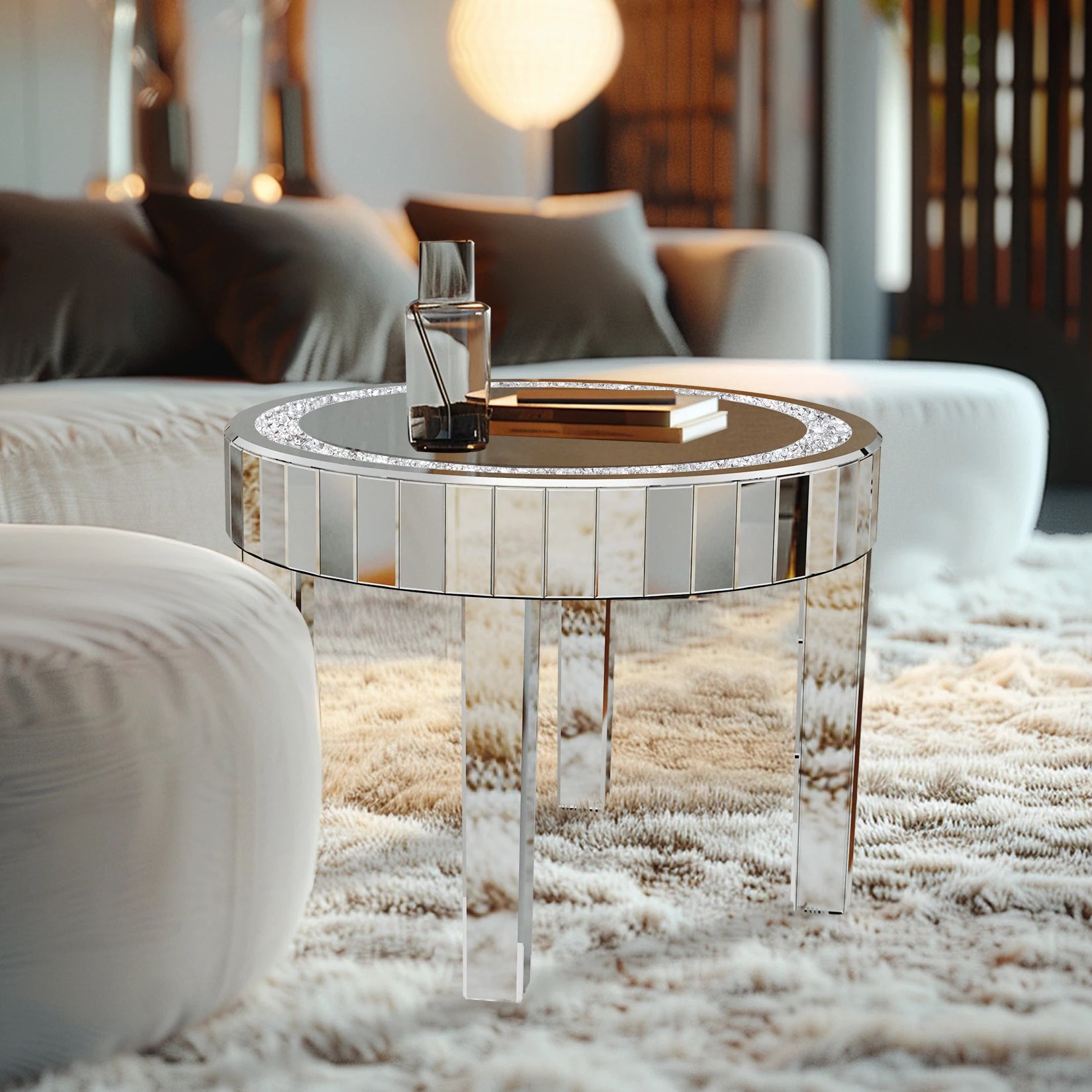 Bring a touch of glamour to your space with the Luxury Mirrored Round Side Table with Crystal Diamond Inlay — a stunning statement piece that blends sophistication with sparkle. Designed with a silver mirrored finish and embedded crystal diamonds, this table reflects light beautifully, creating a luxurious and radiant focal point in any room.