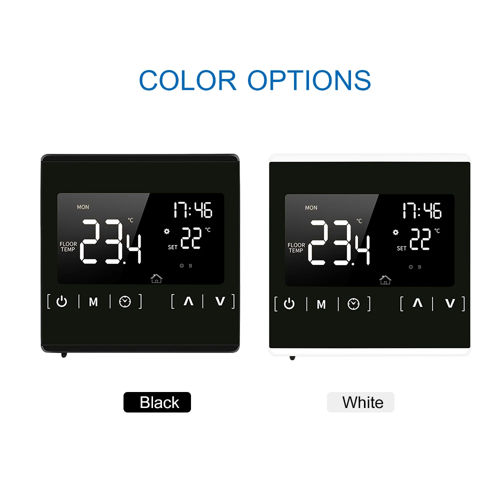 This digital floor heating thermostat uses the advanced microcomputer chip control and high precision sensor to control temperature of electric heating devices. Control motorized ball valve, motorized valve, thermal valve, solenoid valve, heater, electric heating film and electric heating carbon crystal. It's mainly used for floor heating.Features: